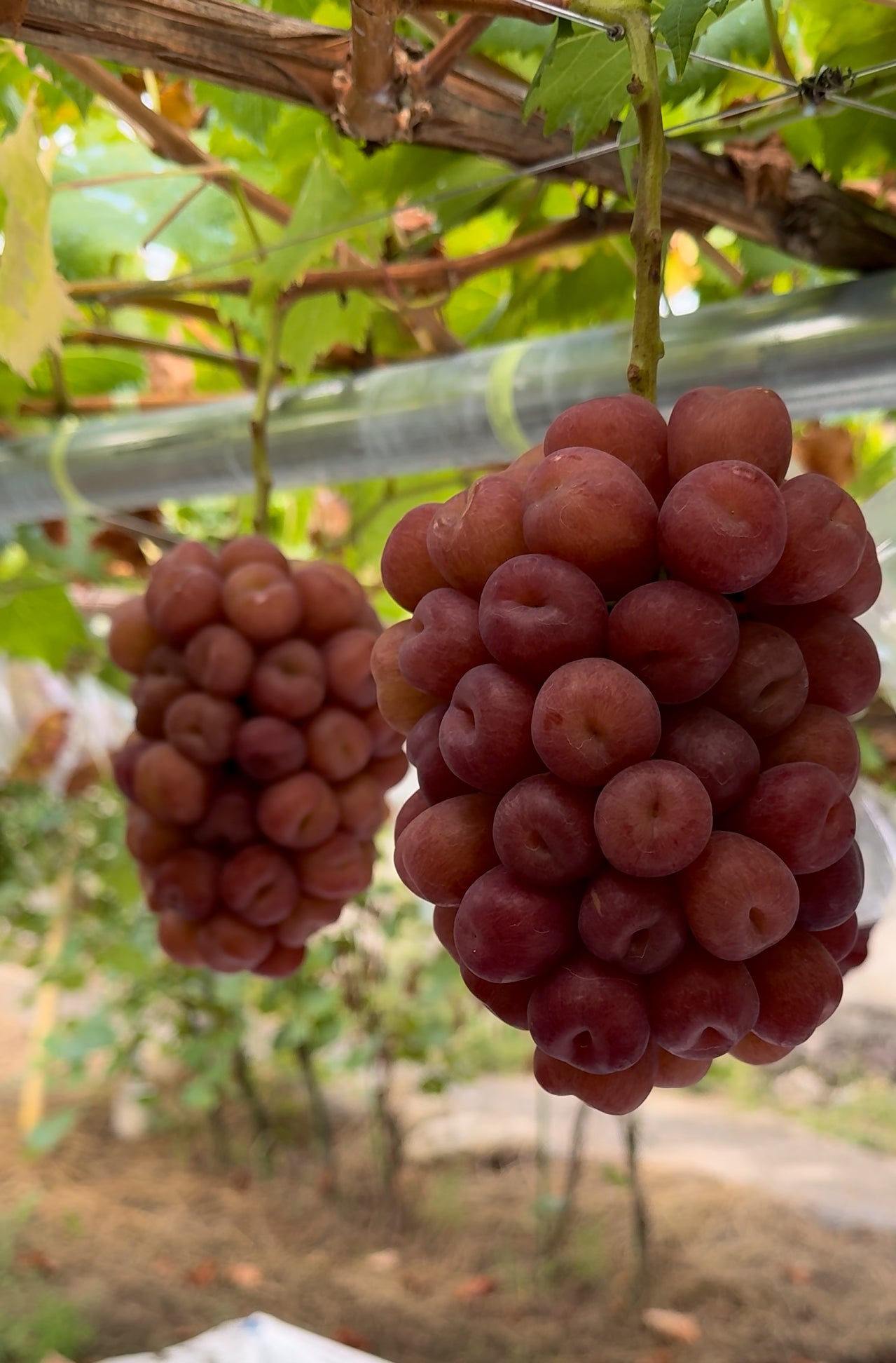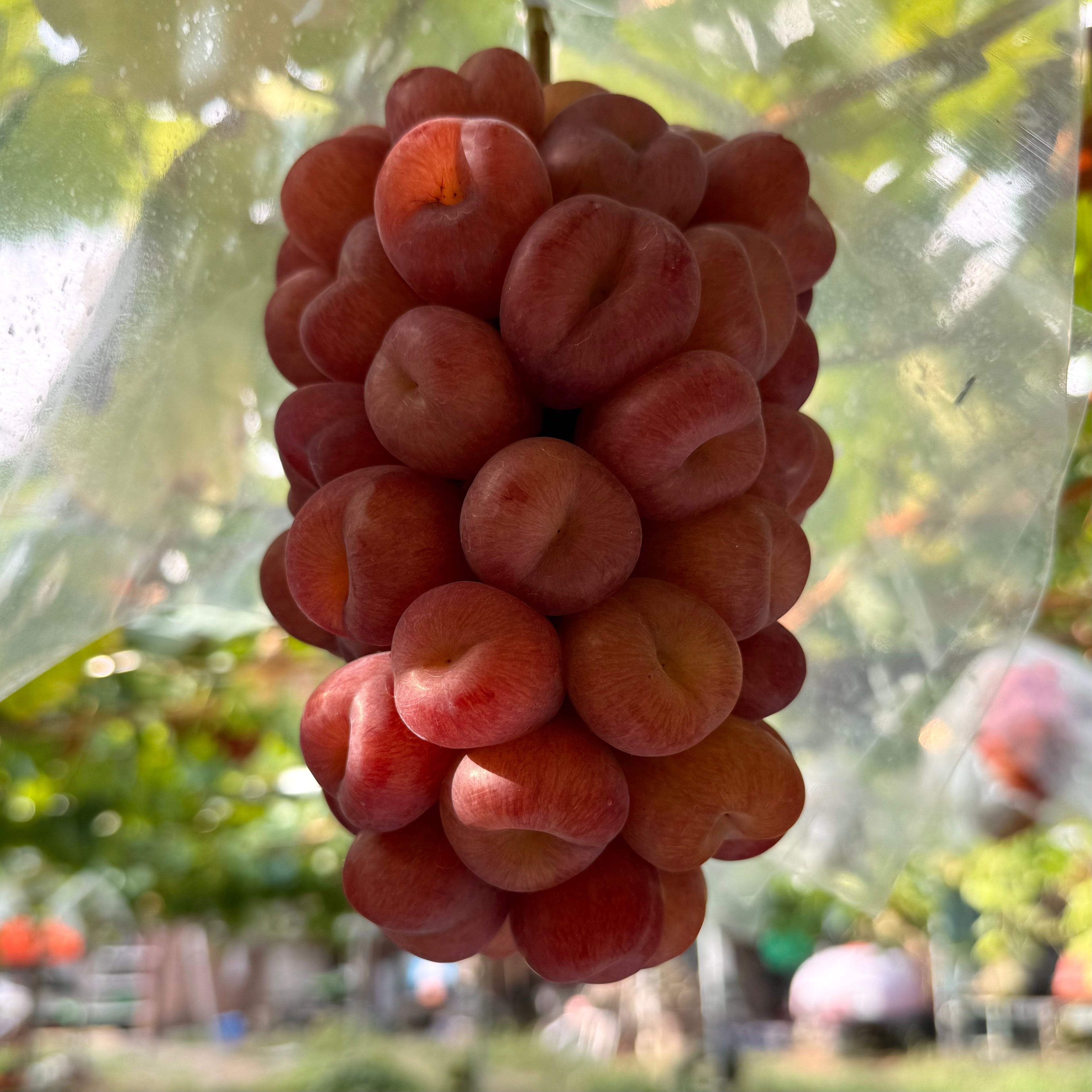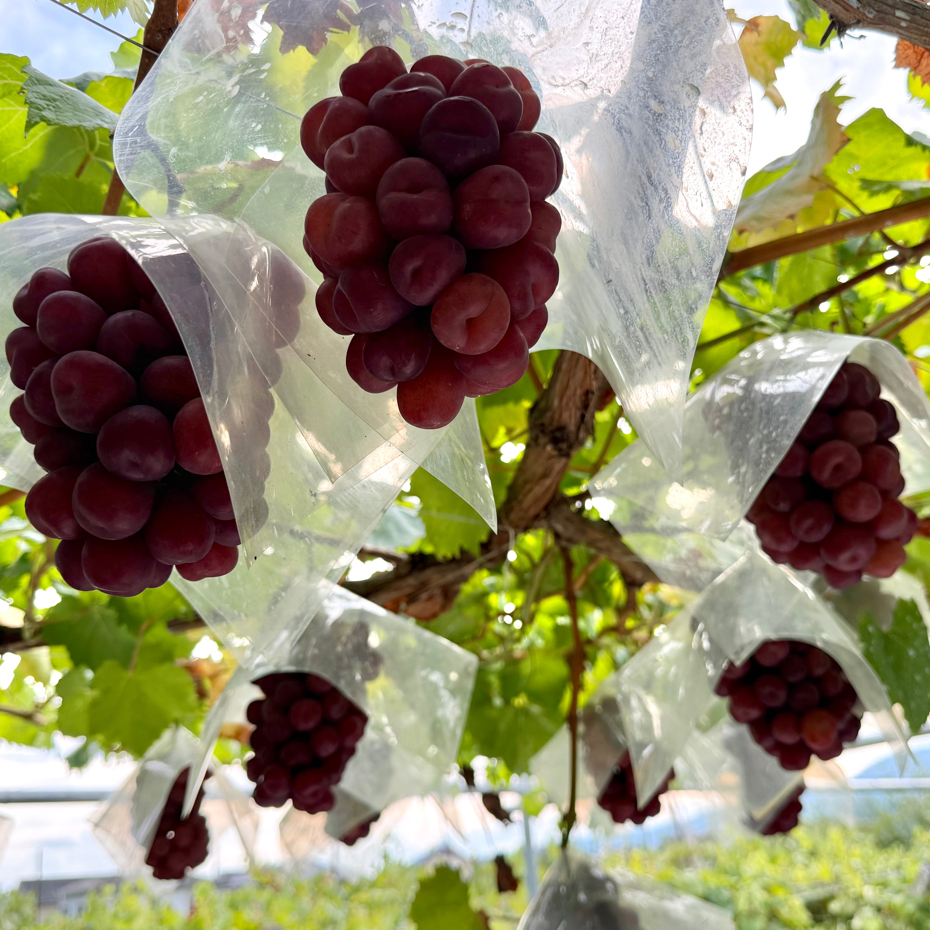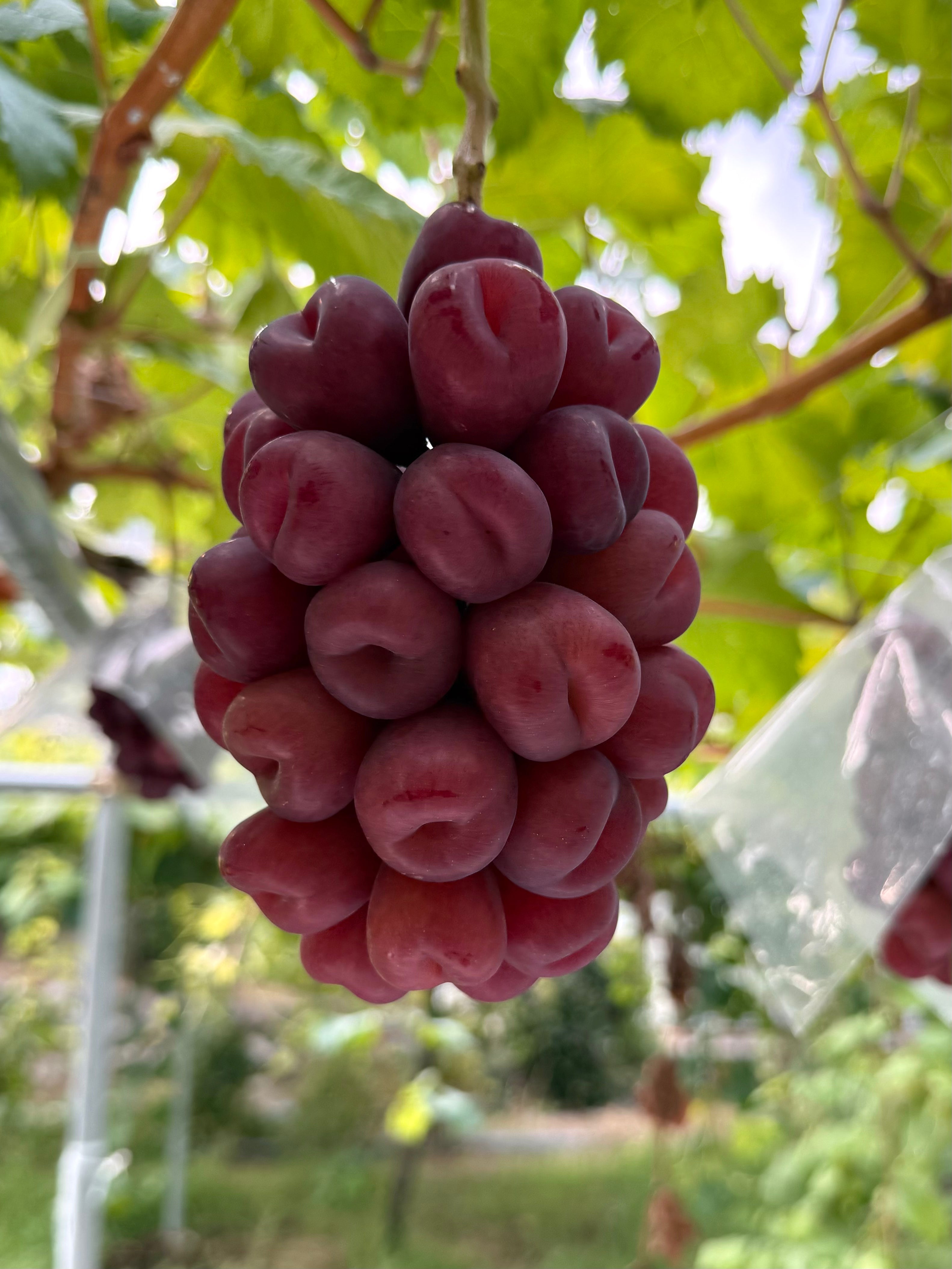 シャインマスカットを親に持つ赤系の品種で、種なし皮ごと食べれます。
